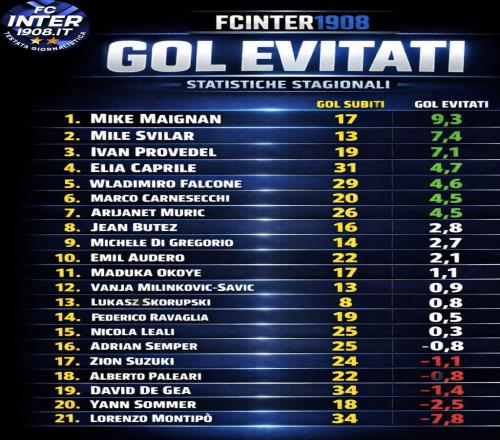 意甲門將阻止預(yù)期進(jìn)球榜:邁尼昂9.3第一,索默2.5倒數(shù)第二