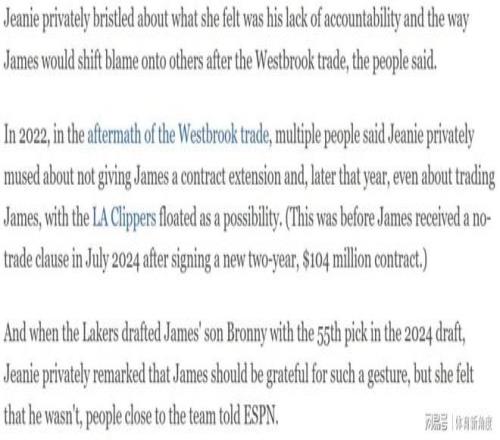 深入探究,珍妮·巴斯對(duì)詹姆斯的不滿(mǎn)情緒,主要聚焦于以下幾個(gè)關(guān)鍵要點(diǎn):