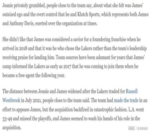 其四,2021年7月那筆拉塞爾·威斯布魯克的交易,成為了珍妮·巴斯與詹姆斯關(guān)系惡化的重要轉(zhuǎn)折點(diǎn)。當(dāng)時(shí),球隊(duì)為了迎合詹姆斯的意愿推動(dòng)了這筆交易,然而結(jié)果卻是一場(chǎng)災(zāi)難。湖人在該賽季僅取得33勝49負(fù)的戰(zhàn)績(jī),無(wú)緣季后賽。更讓珍妮·巴斯不滿(mǎn)的是,詹姆斯似乎試圖撇清自己在推動(dòng)這筆交易中的角色,缺乏應(yīng)有的擔(dān)當(dāng)。據(jù)知情人士透露,珍妮·巴斯私下對(duì)詹姆斯這種“缺乏擔(dān)當(dāng)”以及在威少交易后“將責(zé)任推給他人”的做法極為不滿(mǎn)。