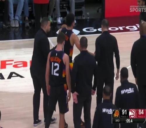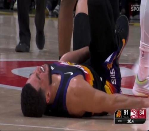 本場比賽,太陽隊除了輸球之外還兩度遭遇球員傷情。在后,德文-布克在第三節(jié)最后時刻也遭遇傷情:他在太陽隊最后一攻時注意力完全放在了后場推進的隊友身上,結(jié)果卻沒看到身前的老鷹球員,右腳踩到了對方的腳造成90度崴腳。倒地后的布克表情非常痛苦,最終他在隊友和工作人員的幫助下起身并回到了更衣室,最終他也提前退場。