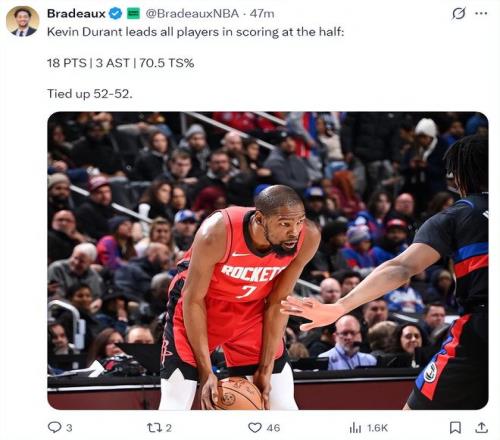 末節(jié)你就看到火箭各種的整活兒,泰特尺一級(jí)惡意犯規(guī),小賈吃T,活塞打出11-1的攻防浪潮,杜蘭特連球都沒摸到就崩盤了,烏度卡叫了兩個(gè)暫停杜蘭特終于獲得出手機(jī)會(huì)連續(xù)3投命中一個(gè)幫助火箭穩(wěn)定局勢(shì)。小賈1帽1斷1板1傳助力杜皇,KD持球干拔再中,火箭拉開到10分鎖定勝局,活塞不放棄KD被吹兩個(gè)三分犯規(guī)很無奈。