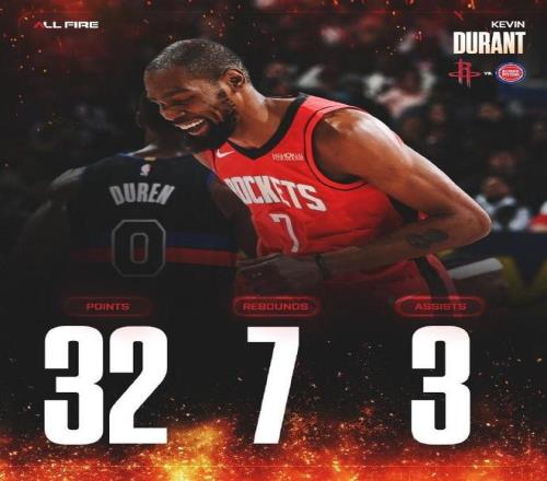 本場比賽,杜蘭特出戰(zhàn)40分40秒,19投11中得到了32分7籃板3助攻1搶斷1蓋帽,三分球11中5,罰球6中5,沒有出現(xiàn)失誤,出現(xiàn)了4次犯規(guī),正負值為全場最高的+18。