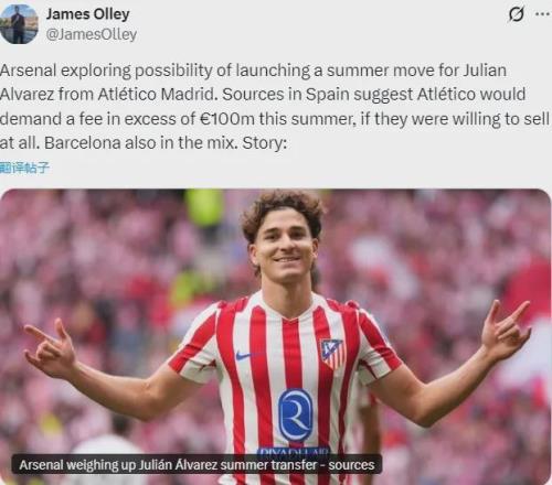 JO指出,阿爾瓦雷斯的合同中有5億歐元的違約金條款,但消息源表示假如馬競(jìng)愿意出售,那么他們今夏的要價(jià)是1億歐元以上。
