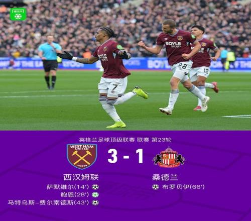北京時間1月24日,英格蘭足球超級聯(lián)賽第23輪,西漢姆聯(lián)主場對陣桑德蘭。鮑恩送出助攻,薩默維爾破門得分;隨后鮑恩主罰命中點球;上半場臨近結(jié)束前,馬特烏斯-費爾南德斯再入一球。下半場,穆杰萊助攻布羅貝伊為桑德蘭扳回一城。最終,西漢姆聯(lián)以3比1取勝。