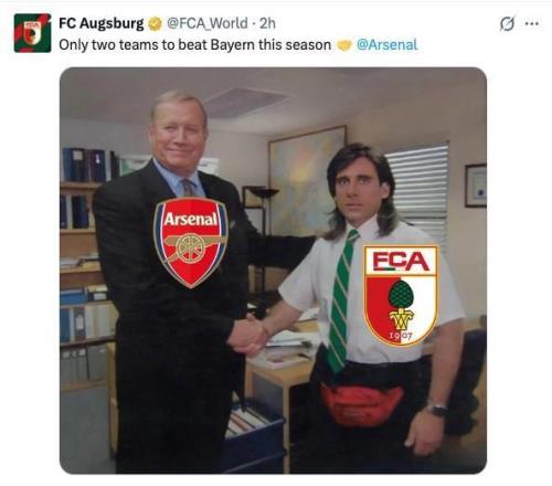 德甲第19輪,奧格斯堡客場2-1戰(zhàn)勝拜仁慕尼黑。賽后奧格斯堡官方社媒曬和阿森納握手梗圖,并表示:“本賽季只有兩支球隊(duì)能擊敗拜仁?!蓖瑫r(shí)艾特了阿森納。