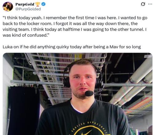 在比賽中場結束時,獨行俠隊記Noah Weber曝出東契奇直接朝著獨行俠的球員通道走去,突然意識到不對后,又轉身朝著位于球場的另一側的湖人球員通道走去。