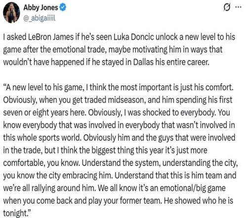 湖人隊另外一名核心詹姆斯也對東契奇的表現(xiàn)給予認可:“他的比賽進入到了全新的層次,這與他的適應程度有關,他在達拉斯度過了7、8年時間,然后在賽季中期被交易,對于任何人來說都是一個震驚的消息?!?/p>