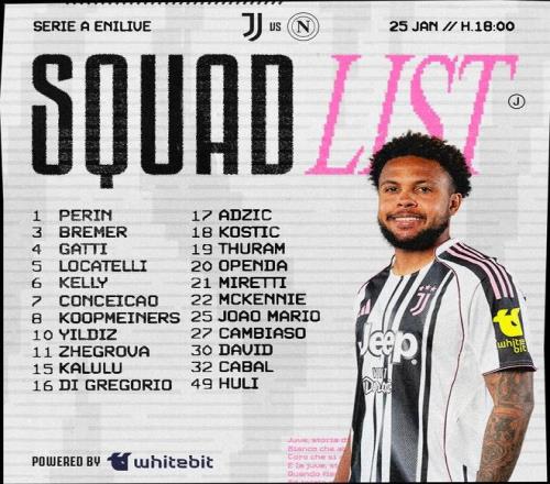 尤文圖斯官方公布了意甲第22輪主場(chǎng)對(duì)陣那不勒斯的比賽大名單,伊爾迪茲領(lǐng)銜,魯希、平索利奧缺席,17歲門將胡利入選。