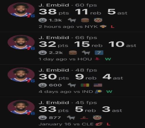 恩比德近期的狀態(tài)不可阻擋,已連續(xù)四場得分30+,分別轟下33分、30分、32分和38分,夢回自己的MVP(22-23賽季)時期。