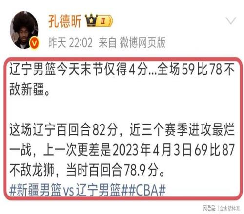 媒體人孔德昕社媒發(fā)文點(diǎn)評(píng)“遼寧男籃今天末節(jié)僅得4分...全場(chǎng)59比78不敵新疆。這場(chǎng)遼寧百回合82分,近三個(gè)賽季進(jìn)攻最爛一戰(zhàn),上一次更差是2023年4月3日69比87不敵龍獅,當(dāng)時(shí)百回合78.9分?!薄?/p>