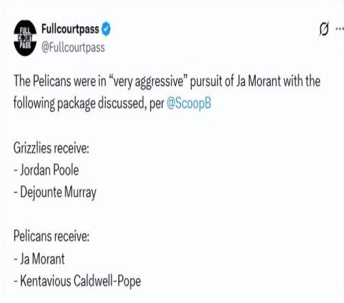 然而,鵜鶘隊卻寸步不讓。新奧爾良方面不愿為任何一套交易方案附加選秀權(quán),他們認為送出的球員籌碼已經(jīng)足以匹配莫蘭特的身價。當灰熊隊提出首輪簽的硬性要求時,鵜鶘目前給出了 “拒絕” 的答復。