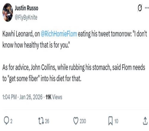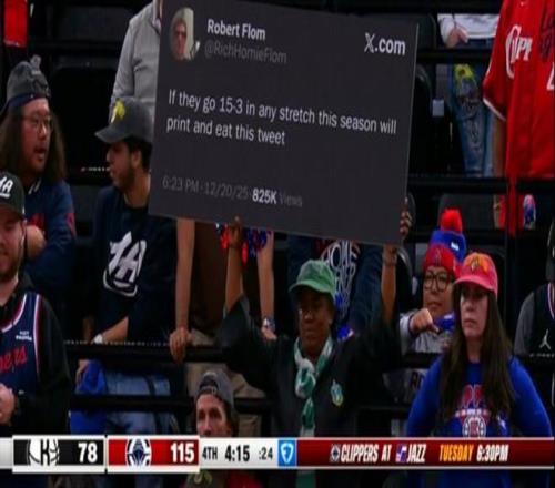 開局快船陷入困境時(shí),一名網(wǎng)友曾公開表示如果本賽季快船任何階段打出15勝3負(fù)表現(xiàn),自己將打印這條推文并吃掉。