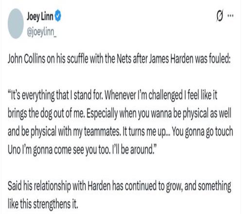 賽后科林斯直言:“這就是我的行事風(fēng)格,如果有人想碰哈登,那我一定會(huì)揍他(You gonna go touch Uno I’m gonna come see you too),我隨時(shí)都在?!?/p>