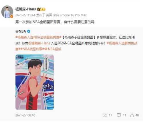 楊瀚森在個人社交媒體發(fā)文:第一次參加NBA全明星新秀賽,有什么需要注意的嗎?網(wǎng)友在評論區(qū)回復(fù):怎么秀怎么來。