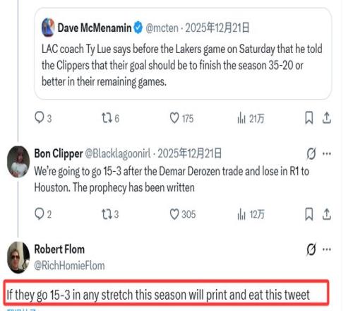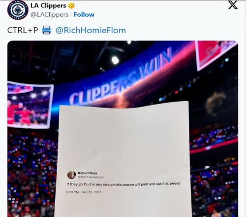 這件事的起因還要追溯到一個多月前,快船主帥泰倫-盧曾在12月21日表示,他向球隊提出了剩余賽程拿下35勝20負(fù)的目標(biāo)。彼時,快船的戰(zhàn)績僅為6勝21負(fù)。弗洛姆當(dāng)時在社媒上回應(yīng)盧的這一目標(biāo)時寫道:“如果快船本賽季能打出一波15勝3負(fù)的戰(zhàn)績,我就把這條推文打印出來吃掉?!?/p>