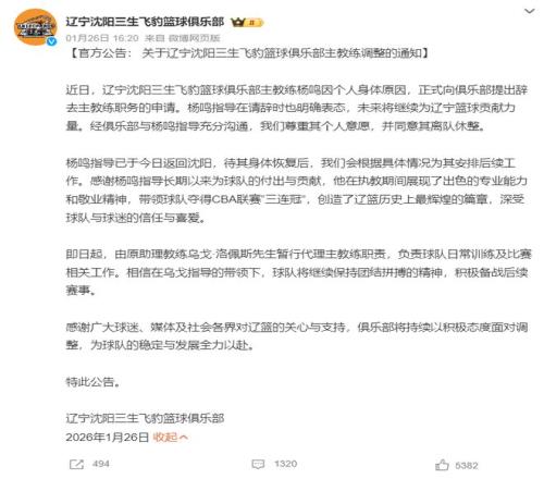 四連敗后楊鳴指導(dǎo)辭職,助理教練烏戈暫代主教練。