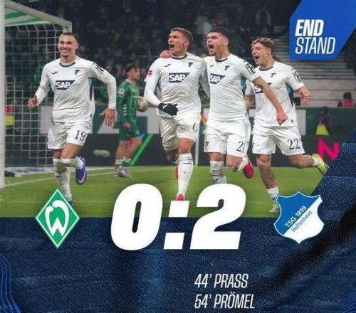 北京時間1月28日03:30,德甲聯(lián)賽第16輪,云達不萊梅在主場威悉球場迎戰(zhàn)霍芬海姆。上半場44分鐘,克拉馬里奇助攻亞歷山大·普拉斯首開紀錄。半場結(jié)束,云達不萊梅0-1霍芬海姆;易邊再戰(zhàn),霍芬海姆中場沃特伯格飛鏟紅牌,普羅梅爾破門,最終云達不萊梅0-2霍芬海姆,云達不萊梅聯(lián)賽9輪不勝,霍芬海姆聯(lián)賽4連勝。