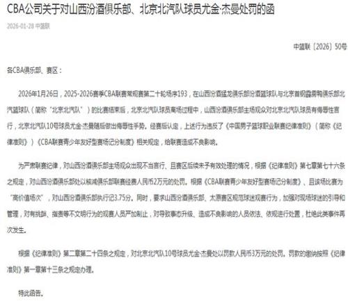 2026年1月26日,2025-2026賽季CBA常規(guī)賽第二十輪,在山西與北京的比賽結(jié)束后,北京球員離場過程中,山西主場觀眾對北京球員有侮辱性言行,北京外援杰曼隨后做出侮辱性手勢。經(jīng)賽后認(rèn)定,上述行為違反《中國男子籃球職業(yè)聯(lián)賽紀(jì)律準(zhǔn)則》、《CBA聯(lián)賽青少年友好型賽場記分制度》相關(guān)規(guī)定,給聯(lián)賽造成不良影響。